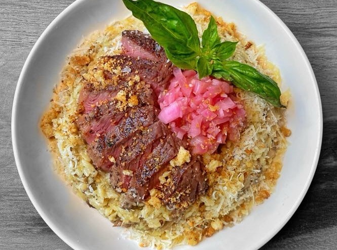 TRUFFLED STEAK ORZOTTO | $30 - 6oz top sirloin, creamy orzotto, pickled shallots, mushrooms, truffle oil, grana padano, pangrattato